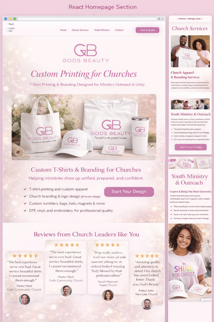 At Gods Beauty, we provide professional T-shirt printing, branding, and custom apparel specifically designed for churches, ministries, and faith-based organizations. We partner with churches to provide consistent, professioanl apparel and promotion materails that support minitstory and outreach.